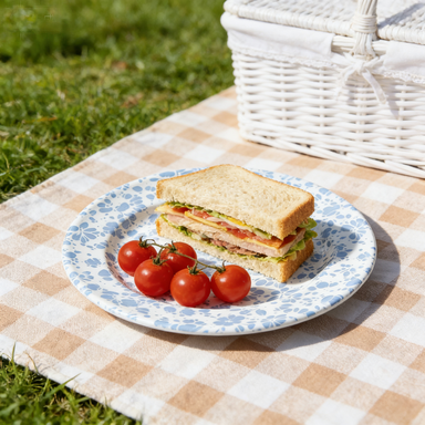 A charming white dinner plate adorned with a delicate sky-blue floral splatter pattern, featuring a smooth, durable finish perfect for everyday meals and casual gatherings. Its fresh, playful design adds a cheerful touch to any table setting.